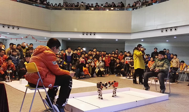 木牛流馬搏擊機器人亮相典禮現(xiàn)場,為現(xiàn)場的領導、老師、家長和小朋友們演示機器人搏斗,吸引了在場所有人的目光,激烈搏斗場面引起小朋友們的陣陣歡呼,掌聲四起,氛圍熱烈。